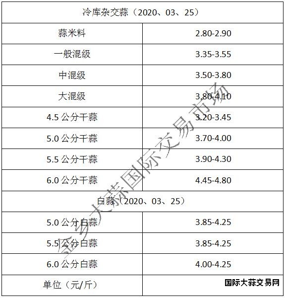 蒜米料2.80-2.90元/斤,一般混级3.35-3.55元/斤,中混级3.50-3.80元/斤,大混级3.90-4.10元/斤,4.5公分级蒜3.20-3.45元/斤,5.0公分级蒜3.70-4.00元/斤,5.5公分级蒜3.90-4.30元/斤,6.0公分级蒜4.45-4.80元/斤,不含极端价格。
