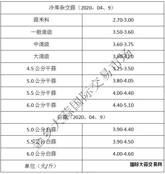 蒜米料2.70-3.00元/斤,一般混级3.50-3.60元/斤,中混级3.60-3.75元/斤,大混级3.80-4.20元/斤,4.5公分级蒜3.25-3.50元/斤,5.0公分级蒜3.80-4.05元/斤,5.5公分级蒜4.00-4.40元/斤,6.0公分级蒜4.40-5.10元/斤,不含极端价格。