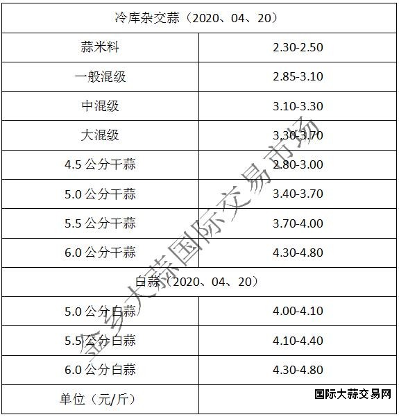 蒜米料2.30-2.50元/斤,一般混级2.85-3.10元/斤,中混级3.10-3.30元/斤,大混级3.30-3.70元/斤,4.5公分级蒜2.80-3.00元/斤,5.0公分级蒜3.40-3.70元/斤,5.5公分级蒜3.70-4.00元/斤,6.0公分级蒜4.30-4.80元/斤,不含极端价格。