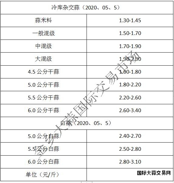蒜米料1.30-1.45元/斤,一般混级1.50-1.70元/斤,中混级1.70-1.90元/斤,大混级1.90-2.30元/斤。4.5公分级蒜1.60-1.80元/斤,5.0公分级蒜1.80-2.20元/斤,5.5公分级蒜2.20-2.60元/斤,6.0公分级蒜2.60-3.40元/斤,价格走低,略显乱行(不含极端价格)。