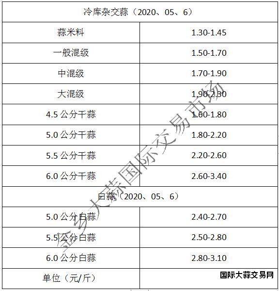 蒜米料1.30-1.45元/斤,一般混级1.50-1.70元/斤,中混级1.70-1.90元/斤,大混级1.90-2.30元/斤。4.5公分级蒜1.60-1.80元/斤,5.0公分级蒜1.80-2.20元/斤,5.5公分级蒜2.20-2.60元/斤,6.0公分级蒜2.60-3.40元/斤,价格平稳,具备有偏硬表现(不含极端价格)。