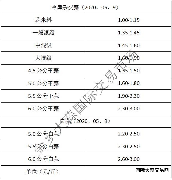 蒜米料1.00-1.15元/斤,一般混级1.35-1.45元/斤,中混级1.45-1.60元/斤,大混级1.60-1.90元/斤。4.5公分级蒜1.35-1.50元/斤,5.0公分级蒜1.60-1.80元/斤,5.5公分级蒜1.90-2.30元/斤,6.0公分级蒜2.30-3.00元/斤,有让价表现(不含极端价格)。