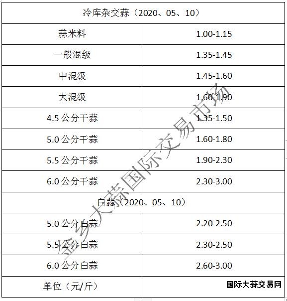 蒜米料1.00-1.15元/斤,一般混级1.35-1.45元/斤,中混级1.45-1.60元/斤,大混级1.60-1.90元/斤。4.5公分级蒜1.35-1.50元/斤,5.0公分级蒜1.60-1.80元/斤,5.5公分级蒜1.90-2.30元/斤,6.0公分级蒜2.30-3.00元/斤,价格保持平稳,部分规格偏硬(不含极端价格)。