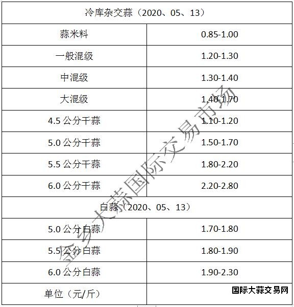 蒜米料0.85-1.00元/斤,一般混级1.20-1.30元/斤,中混级1.30-1.40元/斤,大混级1.40-1.70元/斤。4.5公分级蒜1.10-1.20元/斤,5.0公分级蒜1.50-1.70元/斤,5.5公分级蒜1.80-2.20元/斤,6.0公分级蒜2.20-2.80元/斤,价格偏弱,部分规格有让价表现(不含极端价格)。