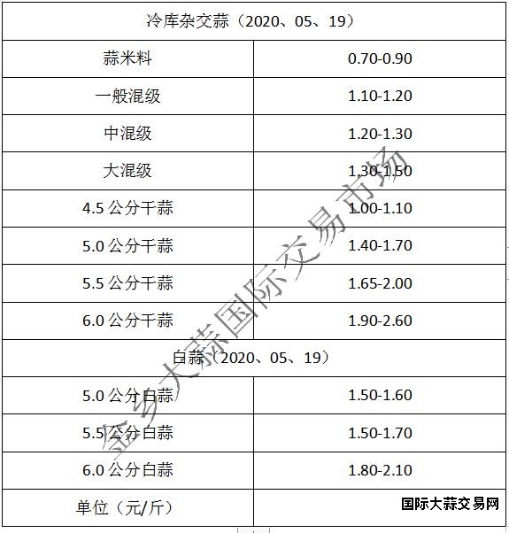 蒜米料0.70-1.00元/斤,一般混级1.10-1.20元/斤,中混级1.20-1.30元/斤,大混级1.30-1.50元/斤。4.5公分级蒜1.00-1.10元/斤,5.0公分级蒜1.40-1.70元/斤,5.5公分级蒜1.65-2.00元/斤,6.0公分级蒜1.90-2.60元/斤,价格有不明显偏强(不含极端价格)。