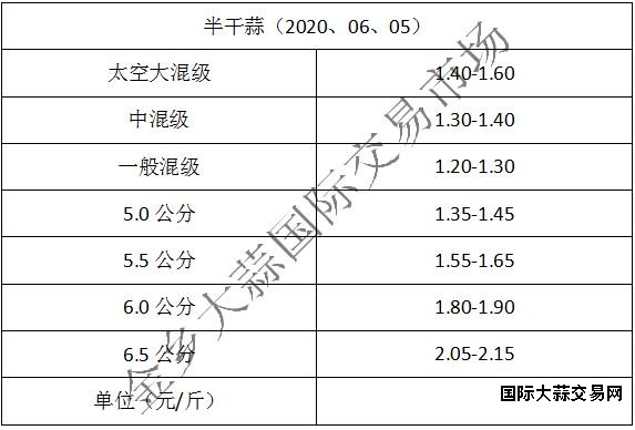 当前太空蒜大混级1.40-1.60元/斤,中混级1.30-1.40元/斤,一般混级1.20-1.30元/斤,价格上涨5分左右。5.0公分太空1.35-1.45元/斤,5.5公分太空1.55-1.65元/斤,6.0公分太空1.80-1.90元/斤,6.5公分太空2.05-2.15元/斤,价格偏强(不含极端价格)。
