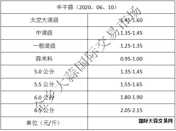 当前太空蒜大混级1.45-1.60元/斤,中混级1.35-1.45元/斤,一般混级1.25-1.35元/斤,蒜米料0.90-1.00元/斤,5.0公分太空1.35-1.45元/斤,5.5公分太空1.55-1.65元/斤,6.0公分太空1.80-1.90元/斤,6.5公分太空2.05-2.15元/斤,部分热需货源有不明显上涨,(不含极端价格)。