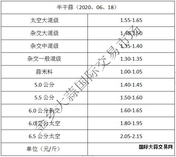 当前杂交大混级1.40-1.50元/斤,中混级1.35-1.40元/斤,一般混级1.30-1.35元/斤,蒜米料1.00-1.05元/斤,太空大混级:1.55-1.65元/斤,5.0公分1.40-1.45元/斤,5.5公分1.50-1.60元/斤,6.0公分杂交:1.60-1.65元/斤,6.0公分太空1.80-1.95元/斤,6.5公分太空2.05-2.15元/斤(不含极端价格)。