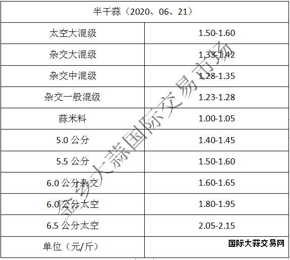 当前杂交大混级1.33-1.42元/斤,中混级1.28-1.35元/斤,一般混级1.23-1.28元/斤,蒜米料1.00-1.05元/斤,太空大混级:1.50-1.60元/斤,价格全天下滑2-3分,本地货源要价坚持,5.0公分1.40-1.45元/斤,5.5公分1.50-1.60元/斤,6.0公分杂交:1.60-1.65元/斤,6.0公分太空1.80-1.95元/斤,6.5公分太空2.05-2.15元/斤(不含极端价格)。