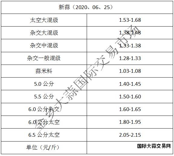 当前杂交大混级1.38-1.48元/斤,中混级1.33-1.38元/斤,一般混级1.28-1.33元/斤,蒜米料1.03-1.08元/斤,太空大混级:1.53-1.68元/斤,价格上涨3分左右,5.0公分1.40-1.45元/斤,5.5公分1.50-1.60元/斤,6.0公分杂交:1.60-1.65元/斤,6.0公分太空1.80-1.95元/斤,6.5公分太空2.05-2.15元/斤(不含极端价格)。