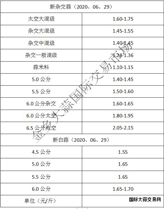 当前杂交大混级1.45-1.55元/斤,中混级1.40-1.45元/斤,一般混级1.28-1.36元/斤,蒜米料1.10-1.15元/斤,太空大混级:1.60-1.75元/斤,5.0公分1.40-1.45元/斤,5.5公分1.50-1.60元/斤,6.0公分杂交:1.60-1.65元/斤,6.0公分太空1.80-1.95元/斤,6.5公分太空2.05-2.15元/斤,本地蒜价格保持平稳,外围货源价格有2-3分下滑(不含极端价格)。