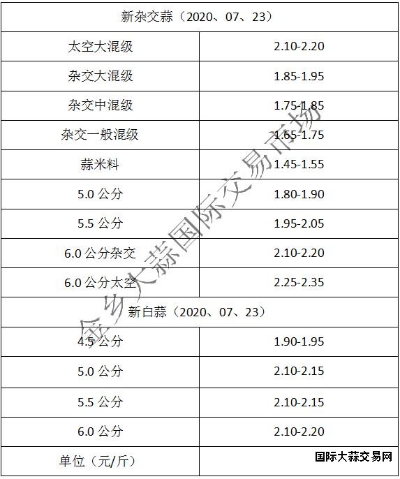 当前杂交大混级1.85-1.95元/斤,中混级1.75-1.85元/斤,一般混级1.65-1.75元/斤,蒜米料1.45-1.55元/斤,太空大混级:2.10-2.20元/斤,5.0公分1.80-1.90元/斤,5.5公分1.95-2.05元/斤,6.0公分杂交:2.10-2.20元/斤,6.0公分太空2.25-2.35元/斤,由于两日未更新,价格有一定变化,今日价格整体保持平稳,外围蒜价格显弱(不含极端价格)。