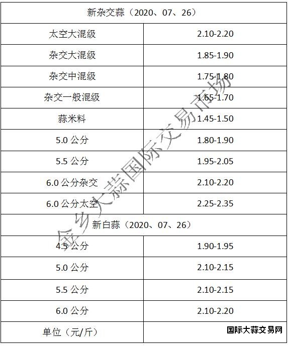 当前杂交大混级1.85-1.90元/斤,中混级1.75-1.80元/斤,一般混级1.65-1.70元/斤,蒜米料1.45-1.50元/斤,太空大混级:2.10-2.20元/斤,5.0公分1.80-1.90元/斤,5.5公分1.95-2.05元/斤,6.0公分杂交:2.10-2.20元/斤,6.0公分太空2.25-2.35元/斤,价格保持平稳,部分规格价格偏强(不含极端格)。