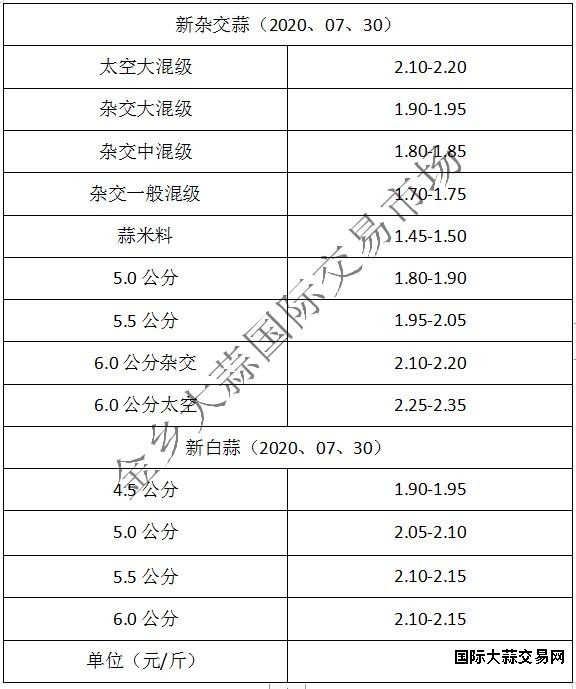 当前杂交大混级1.90-1.95元/斤,中混级1.80-1.85元/斤,一般混级1.70-1.75元/斤,蒜米料1.45-1.50元/斤,太空大混级:2.10-2.20元/斤,5.0公分1.80-1.90元/斤,5.5公分1.95-2.05元/斤,6.0公分杂交:2.10-2.10元/斤,6.0公分太空2.25-2.35元/斤,价格暂稳,本地蒜有2-3分偏强表现,外围蒜小幅走低(不含极端格)。
