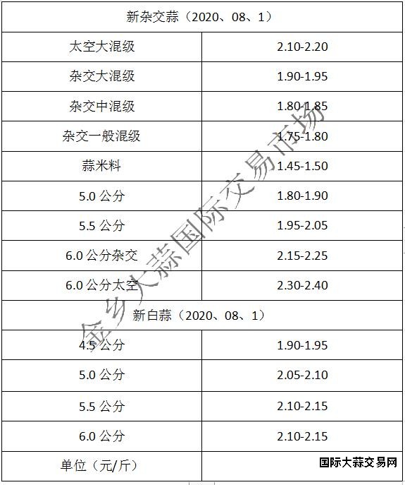 当前杂交大混级1.90-1.95元/斤,中混级1.80-1.85元/斤,一般混级1.75-1.80元/斤,蒜米料1.45-1.50元/斤,太空大混级:2.10-2.20元/斤,5.0公分1.80-1.90元/斤,5.5公分1.95-2.05元/斤,6.0公分杂交:2.15-2.25元/斤,6.0公分太空2.25-2.35元/斤,价格保持平稳(不含极端格)。