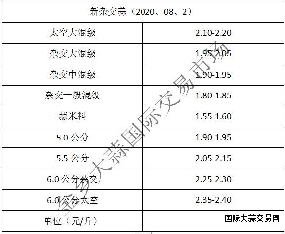 当前杂交大混级1.95-2.05元/斤,中混级1.90-1.95元/斤,一般混级1.80-1.85元/斤,蒜米料1.55-1.60元/斤,太空大混级:2.10-2.20元/斤,5.0公分1.90-1.95元/斤,5.5公分2.05-2.15元/斤,6.0公分杂交:2.25-2.30元/斤,6.0公分太空2.35-2.40元/斤,价格偏强,部分规格价格上涨5分到1毛(不含极端格)。