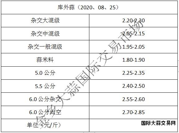 当前库外杂交大混级2.20-2.30元/斤,中混级2.05-2.15元/斤,一般混级1.95-2.05元/斤,蒜米料1.80-1.90元/斤,5.0公分2.25-2.35元/斤,5.5公分2.40-2.50元/斤,6.0公分杂交:2.55-2.60元/斤,6.0公分太空2.70-2.85元/斤,库外蒜混级价格走弱,中低价位货源有5分左右下滑,级蒜价格略显混乱,高低货源价格差扩大(不含极端价格)。