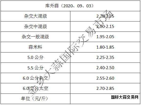 当前库外杂交大混级2.20-2.25元/斤,中混级2.00-2.15元/斤,一般混级1.95-2.05元/斤,蒜米料1.80-1.85元/斤,5.0公分2.25-2.35元/斤,5.5公分2.40-2.50元/斤,6.0公分杂交:2.55-2.60元/斤,6.0公分太空2.70-2.85元/斤,价格平稳(不含极端价格)。