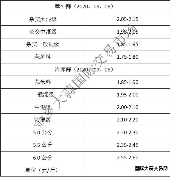 当前库外杂交大混级2.05-2.15元/斤,中混级1.95-2.05元/斤,一般混级1.85-1.95元/斤,蒜米料1.75-1.80元/斤,主流价格基本平稳,但蒜米料价格下滑5分左右(不含极端价格)。