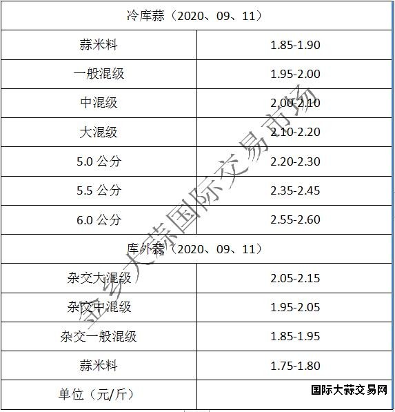 当前库外杂交大混级2.05-2.15元/斤,中混级1.95-2.05元/斤,一般混级1.85-1.95元/斤,蒜米料1.75-1.80元/斤,(不含极端价格)。