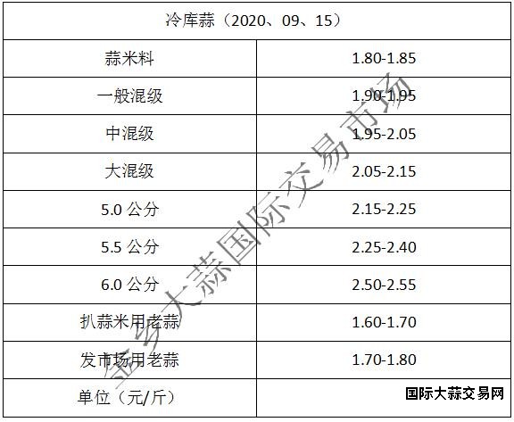 冷库蒜:蒜米料1.80-1.85元/斤,一般混级1.90-1.95元/斤,中混级1.95-2.05元/斤,大混级2.05-2.15元/斤。5.0级蒜2.15-2.25元/斤,5.5级蒜2.25-2.40元/斤,6.0级蒜2.50-2.55元/斤,扒米用老蒜1.60-1.70元/斤,发市场用老蒜1.70-1.80元/斤,价格稳中显弱。