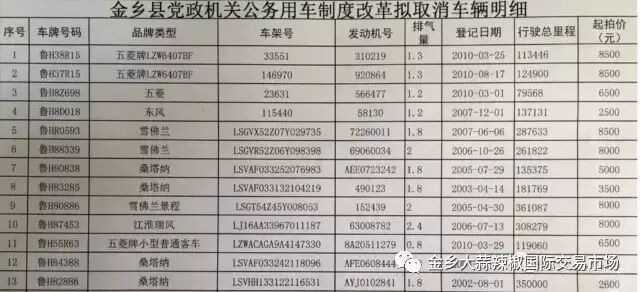 拍卖标的:金乡县60辆公务用车(所有车辆不包含车牌),车型包括:雪佛兰、五菱、桑塔纳、江淮、别克、帕萨特、本田、红旗、现代、福特、长城、东风等。