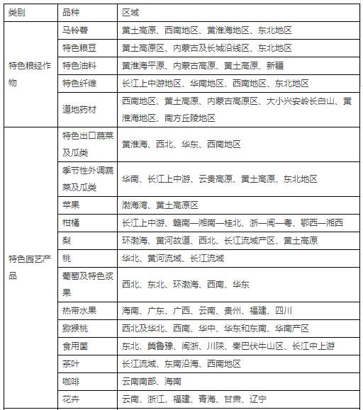 具体,我们来看看下面这个表格。从表格中我们可以很清晰的看出哪些区域重点发展哪些特色品种。