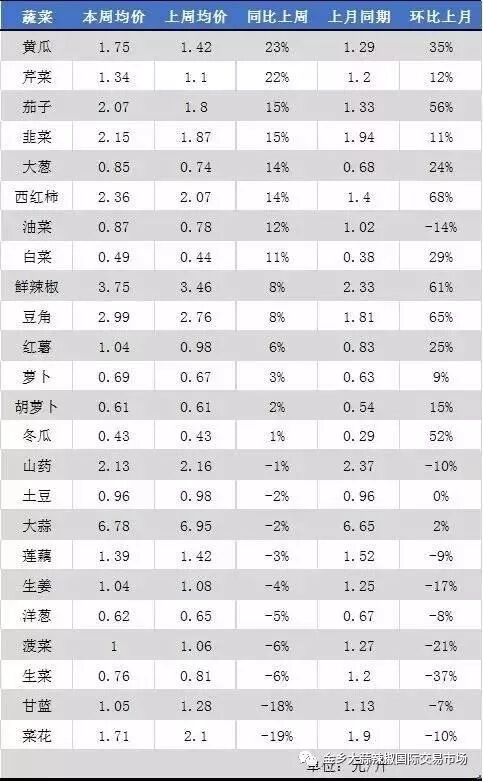 从本周蔬菜行情与上周以及上月的涨跌情况来看,蔬菜整体涨跌趋势保持一致,即在一个月内大部分蔬菜价格,呈现出持续上涨或者持续下滑的趋势。
