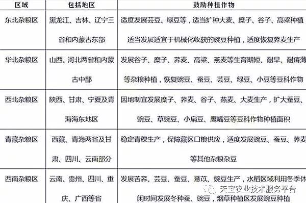 2016年国家发布的《2016年全国杂粮生产指导意见》等文件,就已将全国划分为5个区,指导杂粮产业发展。分别是:东北杂粮区,重点鼓励种植芸豆、绿豆等,适当扩种大麦、糜子、谷子、高粱;华北杂粮区,重点鼓励种植谷子、绿豆、荞麦等生育期短、耐旱、耐瘠薄等杂粮;西北杂粮区,重点鼓励种植糜子、荞麦、谷子等;青藏杂粮区,重点鼓励种植青稞,保障藏区口粮供应;西南杂粮区,重点鼓励种植苦荞、芸豆、蚕豆等品种。