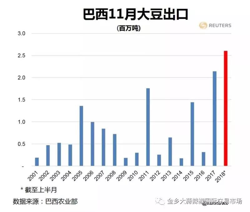 11月上半月期间巴西出口260万吨大豆,这已超过去年的单月最高纪录214万吨。10月出口量为535万吨,是历年同期最高纪录的两倍有余。