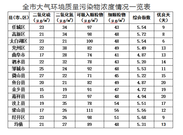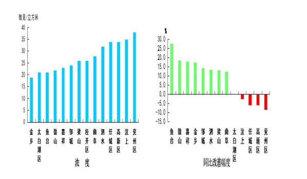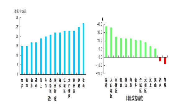 二氧化氮浓度最好的县(市、区)是金乡县,为19微克/立方米;最差的县(市、区)是兖州区,为38微克/立方米;同比改善幅度最大的县(市、区)是鱼台县,为27.6%,同比恶化幅度最大的县(市、区)是兖州区,为8.6%。