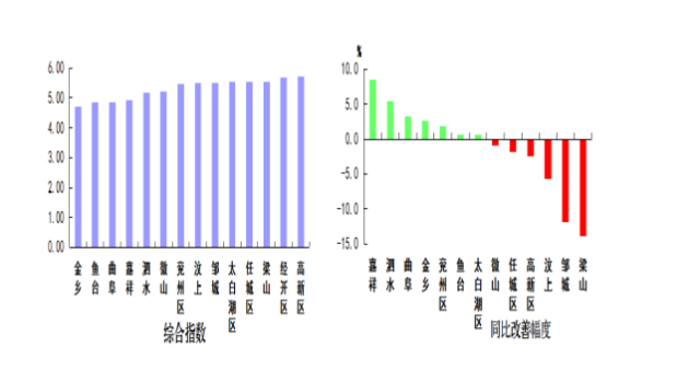 优良天最多的县(市、区)是鱼台县和嘉祥县,均为20天;最少的县(市、区)是太白湖区,为6天;14县(市、区)同比均恶化,同比恶化幅度最大的县(市、区)是邹城市,为54.8个百分点。