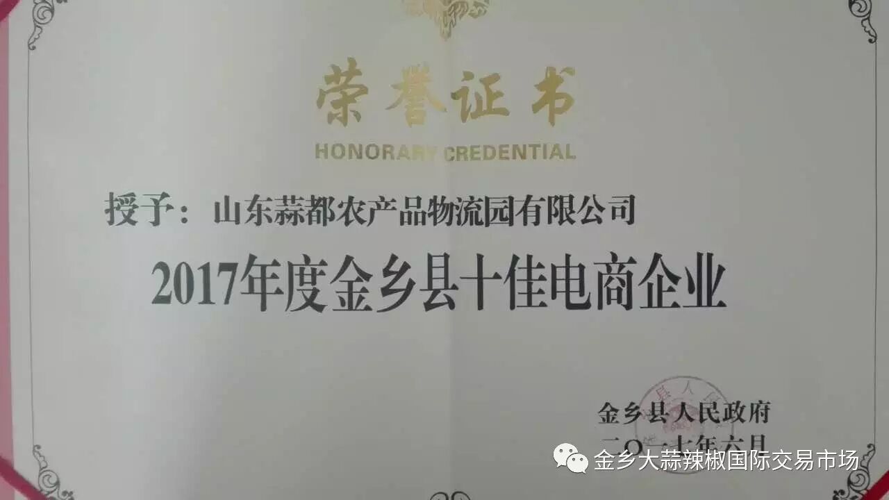 为表彰先进,树立典型,提升我县大蒜产业竞争力,根据“2017年金乡县‘双十佳’评选活动”评选结果,现对“老乡味”等10个大蒜品牌授予“金乡大蒜十佳品牌”,对山东蒜都农产品物流园有限公司等10家电商企业授予“金乡县十佳电商企业”。
