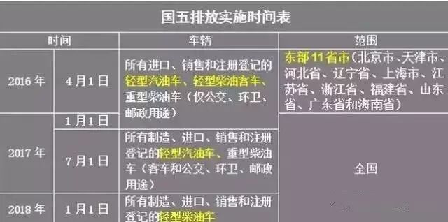 所有进口、销售和注册登记的轻型汽油车、轻型柴油客车、重型柴油车(仅公交、环卫、邮政用途),须符合国五标准要求。换句话说:在这些地区,达不到国五要求的新车,不能卖,我们也不能买,更没法儿上牌。